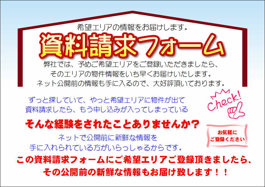 新築戸建(分譲住宅) 新築戸建(分譲住宅)のメリットは ●図面ではなく、実物が確認できる ●土地から購入なのに安く購入できる ●すぐに入居できるので家賃節約できる ●近隣の方も、新規入居のため住みやすい など ご購入者様には多数の利点があります。 ただ、良い立地の物件は、 皆欲しがっておりますので いち早く、分譲情報を 手に入れる必要があります。 弊社では、新築戸建・分譲情報を ご登録の方にいち早くお届けします。 ご登録は無料です。 お名前 (必須) ご住所 (必須) メールアドレス (必須) 電話番号 (必須) 希望物件種別 (必須) 新築戸建中古戸建売土地マンション お探しエリア (必須) 一宮市名古屋市稲沢市江南市岩倉市清須市あま市愛西市北名古屋市小牧市犬山市春日井市大口町扶桑町岐阜市各務原市羽島市笠松町柳津町岐南町大垣市瑞穂市安八郡その他 ご要望詳細(学区・町名・広さ・駅からの距離などできるだけご希望を入力ください。) 確認ページはございません。内容をご確認の上チェックを入れてください。 Δ Share Facebook Twitter Pinterest Linkedin